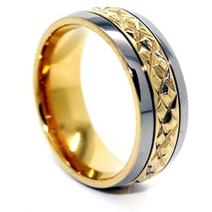 This spectacular wedding band is 18k yellow gold plated with a Titanium inlay, combining durability and beauty. The intricately designed middle gold provides additional detail that makes this ring an attention grabber. The ring is 7mm wide and provides a durable, comfortable style while still portraying elegance and style.