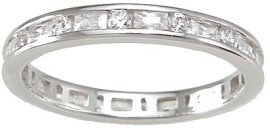 Get the look of white gold without breaking the bank! This classic style sterling silver eternity band is encircled by channel set cubic zirconia stones. This band is 2 millimeters wide and is perfect for stacking. It is designed in solid sterling silver and is plated in a platinum derivatire for years of tarnish free wear.